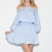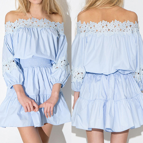 spliced slash neck,puff sleeve and gathered waist design make this piece look so charming and
