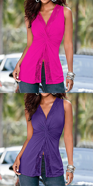Wow,such a chic yet sexy tops. Solid color style,its lace spliced v-neck,slit hem and kinked