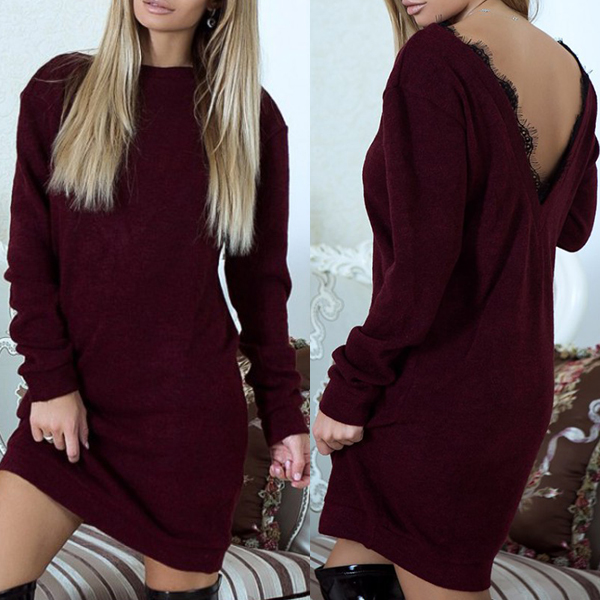 This dress features a solid color,finished with long sleeve,v-shaped backless and lace spliced details at back side,