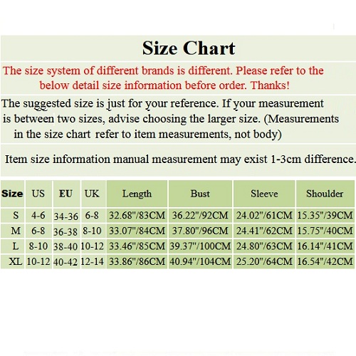 XL : Bust : 104cm(40.94"); Shoulder : 42cm(16.54"); Sleeve : 64cm(25.2"); Length : 86cm(33.86");