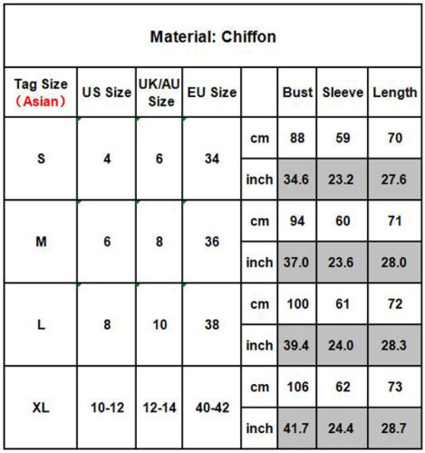 XL : Bust : 106cm(41.73"); Sleeve : 62cm(24.41"); Length : 73cm(28.74");
