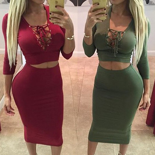 Including a long sleeve lace-up deep v-neck top and a high waist bust skirt,this two-piece