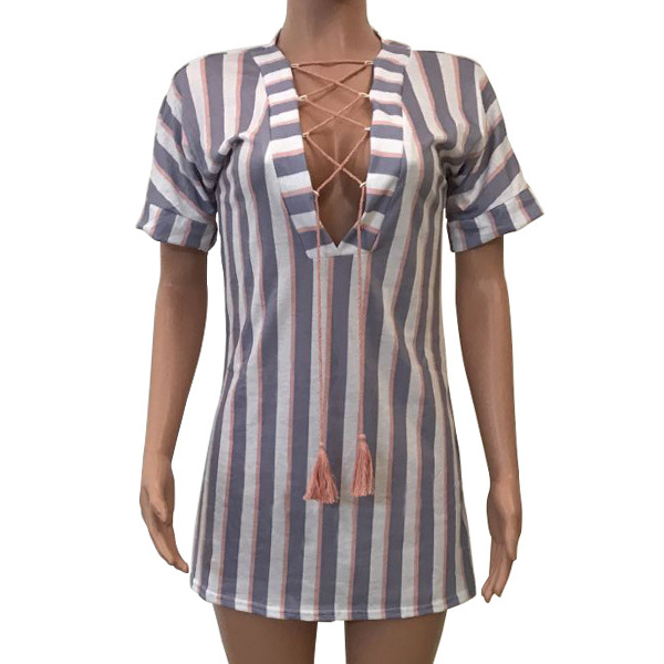 with short sleeve,lace-up deep v-neck and a loose silhouette,this dress is your perfect choice on these casual days.