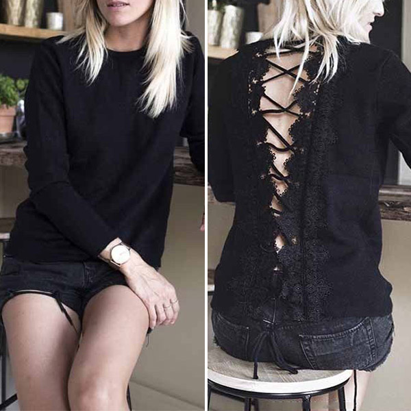 Sexy Lace-up Lace Spliced Long Sleeve Round Neck T-shirt