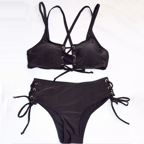 The bikini top of this bikini set is styled with a lace-up design at the front part while the bikini bottom