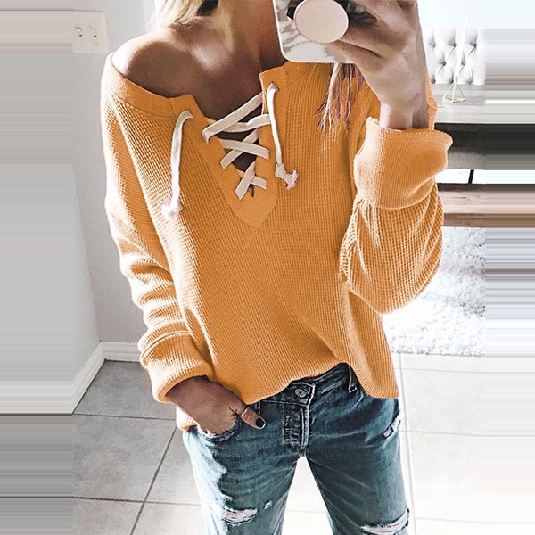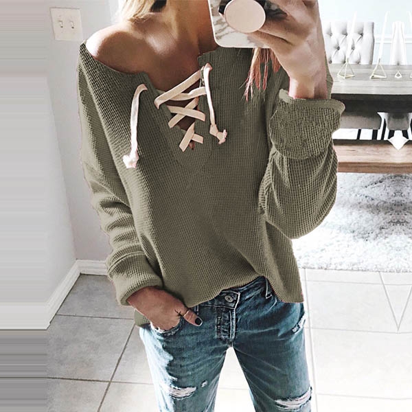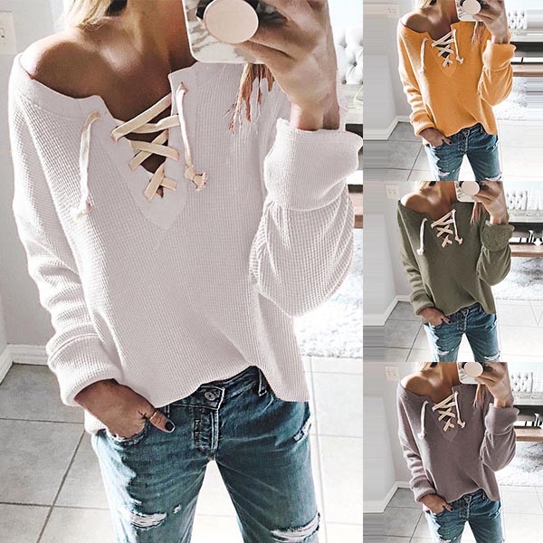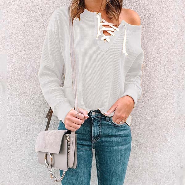 piece into your smart ensemble? Comes with a solid color,the lace-up v-neck design will further