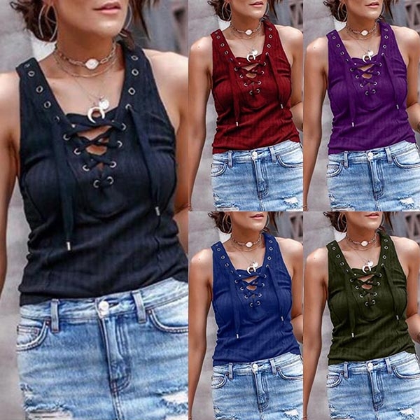 Greet these sunny summer days with this sexy tank top. Solid color style,the lace-up v-neck design is the highlight,