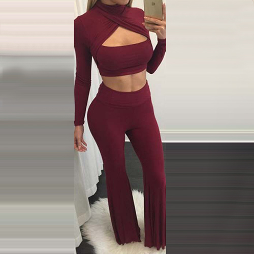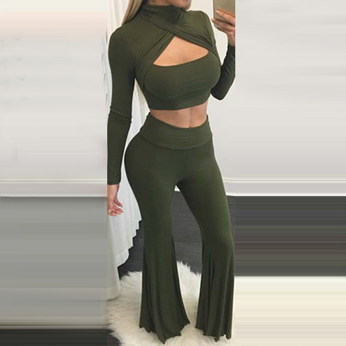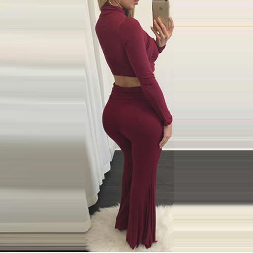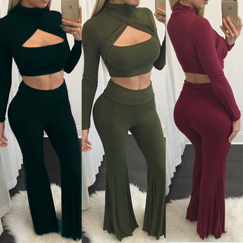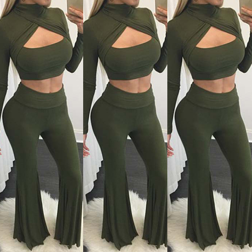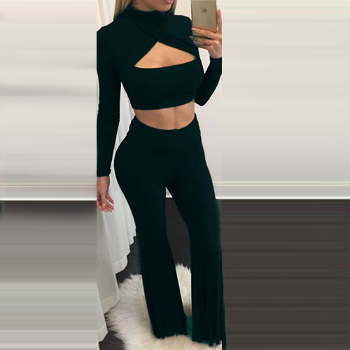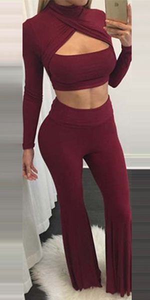 Solid color style,including a long sleeve hollow out crop tops and a high waist flares,this two-piece set