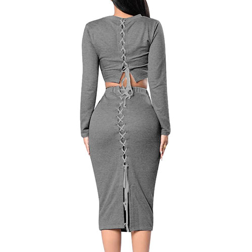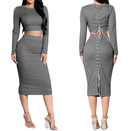 Solid color style,including a long sleeve round neck crop top and a high waist skirt,this two-piece