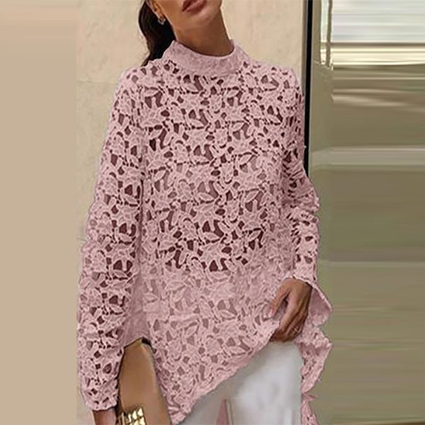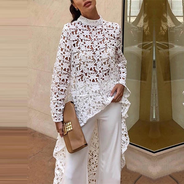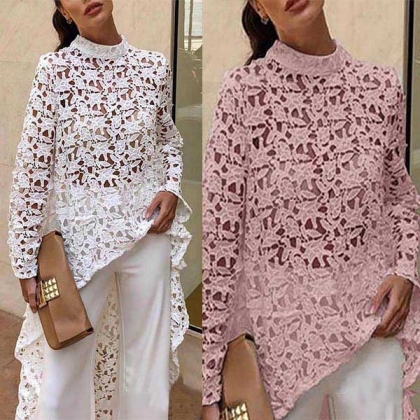 Sexy Long Sleeve Round Neck Irregular Hem Hollow Out Lace Top