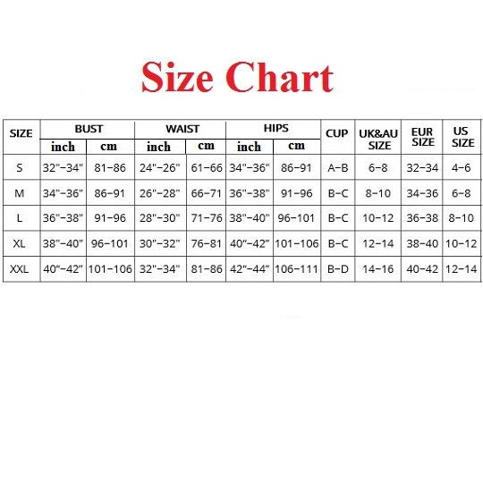 XXL : Bust : 101cm - 106cm(39.76" - 41.73"); Waist : 81cm - 86cm(31.89" - 33.86"); Hips : 106cm - 111cm(41.73" - 43.7");