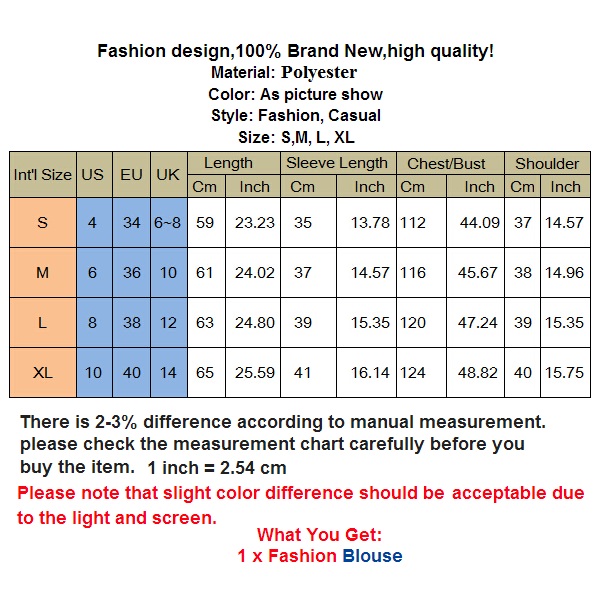 XL : Bust : 124cm(48.82"); Sleeve : 41cm(16.14"); Length : 65cm(25.59");