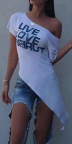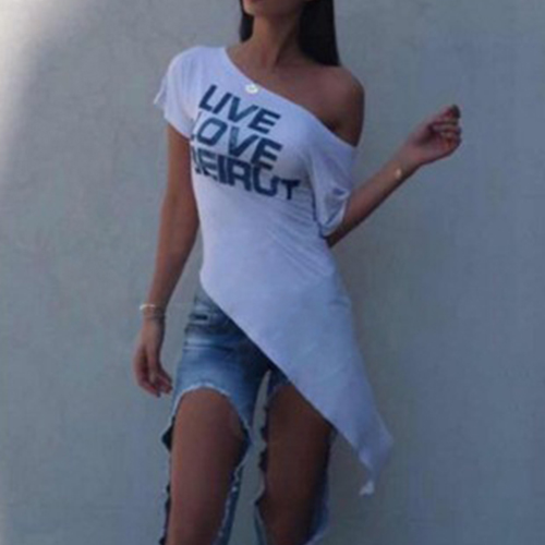 Once you slip into this top,more attention would be grabbed. Letters printed style,designed with oblique shoulder and an