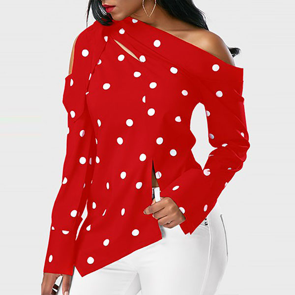 Dots printed design makes it look so stylish and playful,while the oblique shoulder and irregular hem