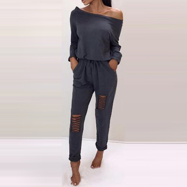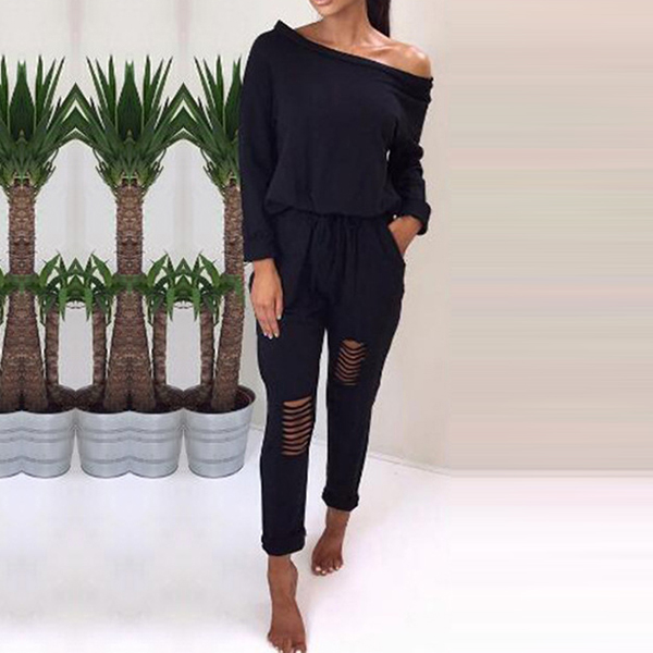 Wanna gives others a totally new image? Then slip into this jumpsuit. Solid color style,the oblique shoulder and hollow
