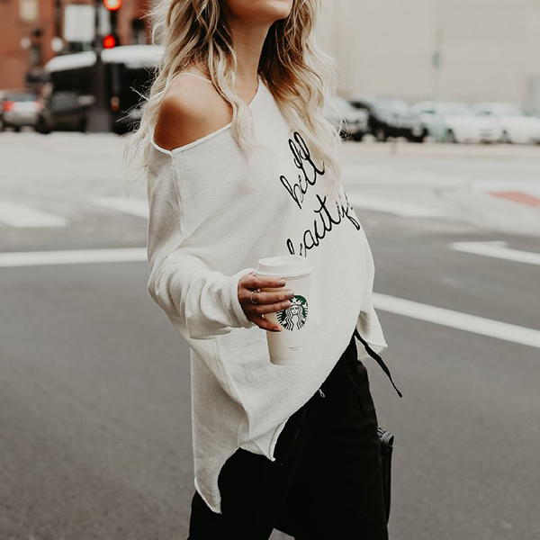 It is easy to achieve for a cozy,stylish yet feminine style through this knit top. The white tone with letters printed