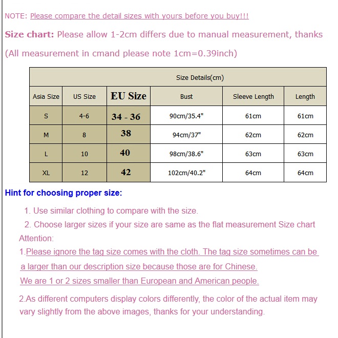 XL : Bust : 102cm(40.16"); Sleeve : 64cm(25.2"); Length : 64cm(25.2");