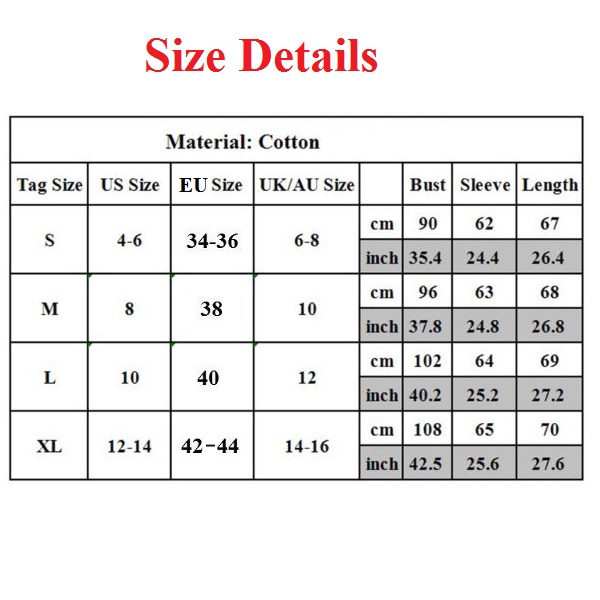 XL : Bust : 108cm(42.52"); Sleeve : 65cm(25.59"); Length : 70cm(27.56");
