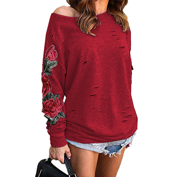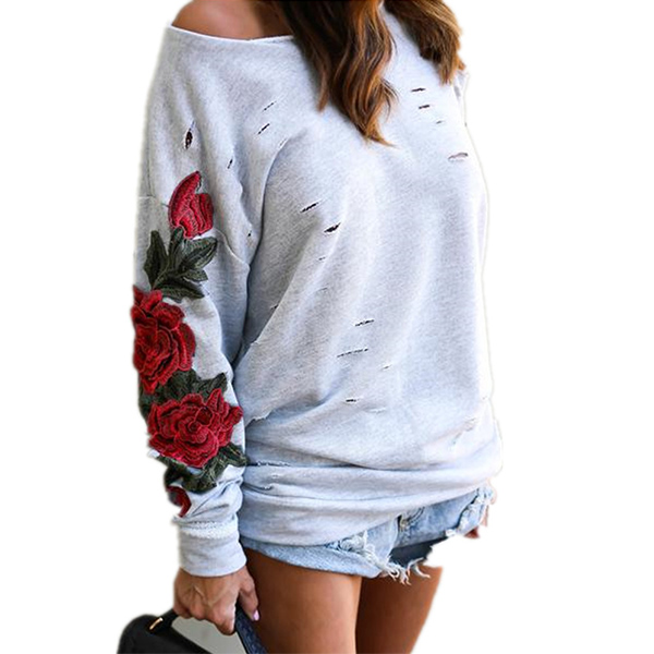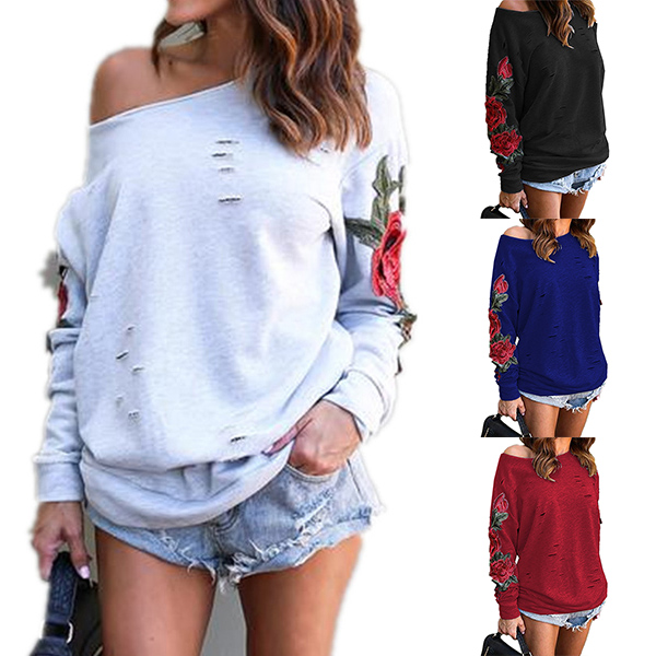 oblique shoulder,rose embroidered and ripped details,this sweatshirt is a perfect combination of classic and unique style.