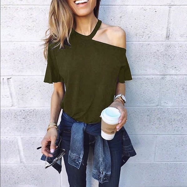 breathable fabric will offer you a comfortable day,while the oblique shoulder and unique halter design will make