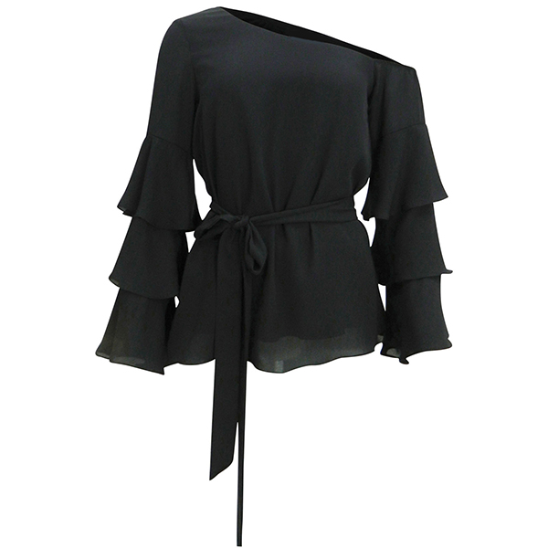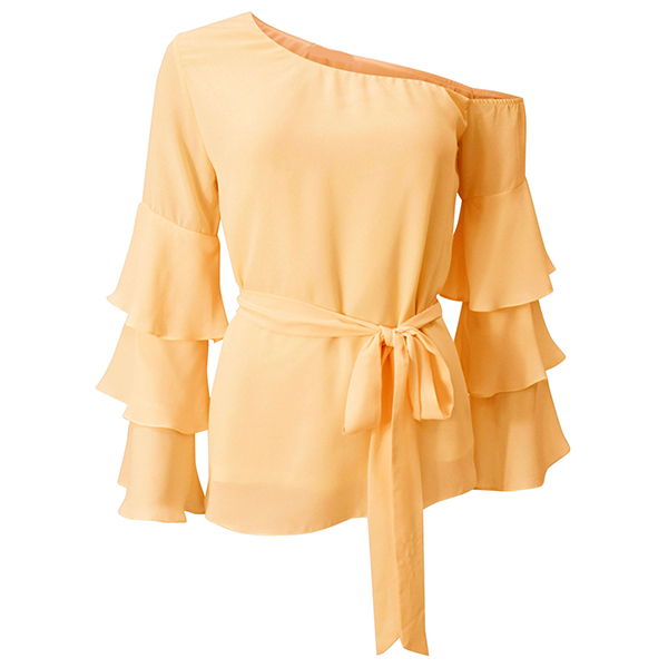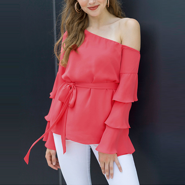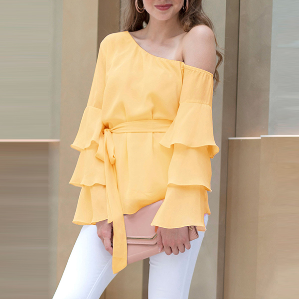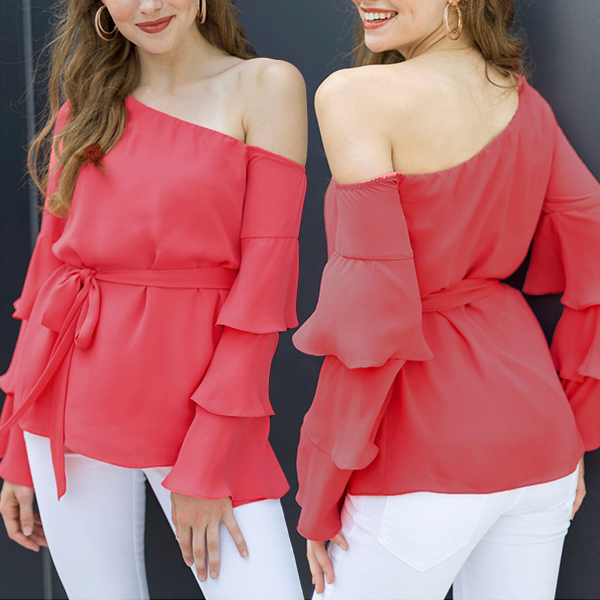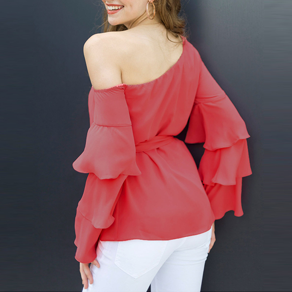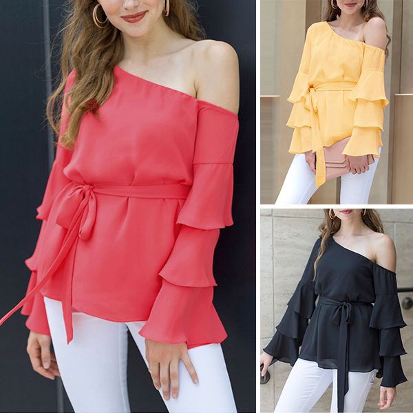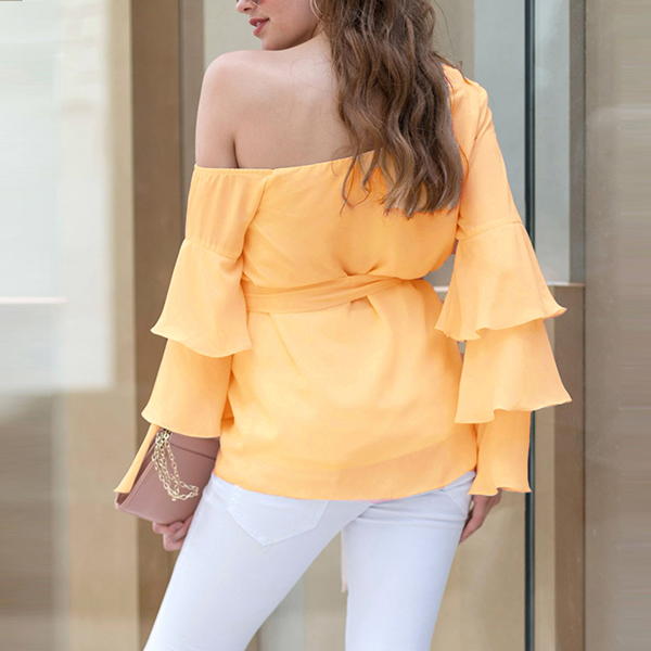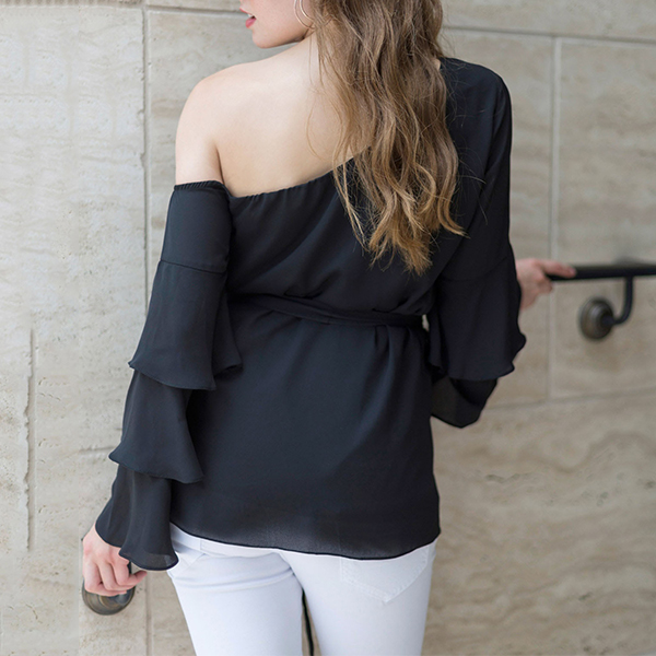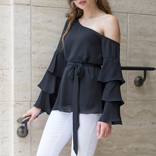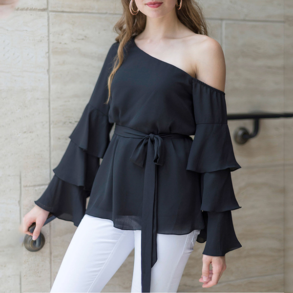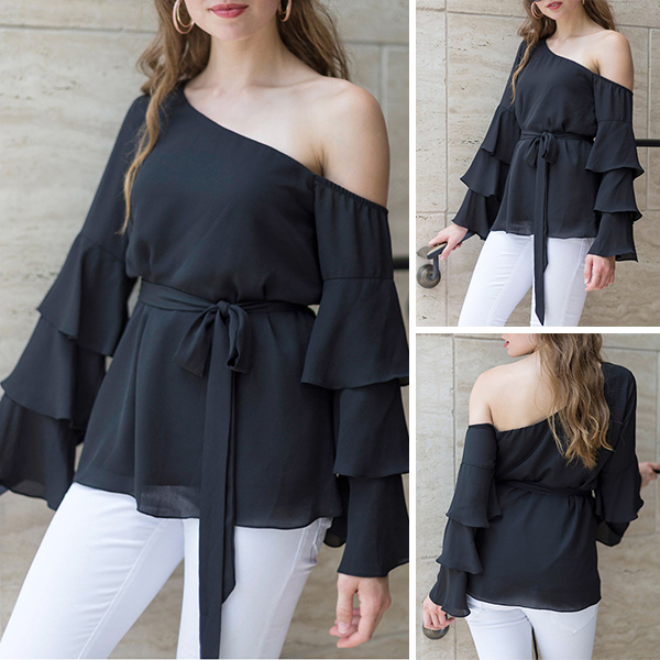 Sexy Oblique Shoulder Trumpet Sleeve Solid Color Chiffon Top