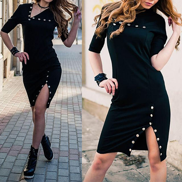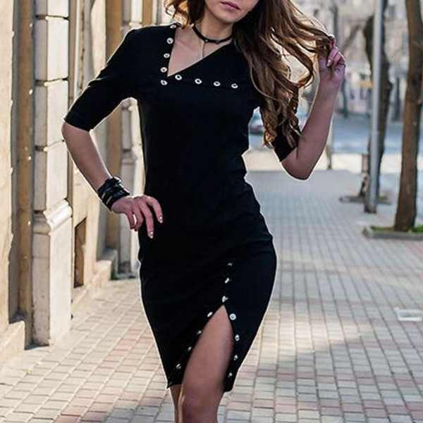 This dress features a classic yet mysterious black tone,accompanied with half sleeve,oblique v-neck,slit hem
