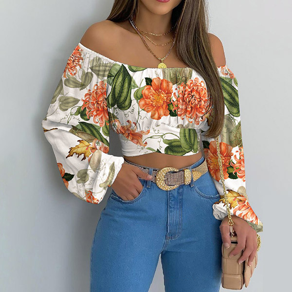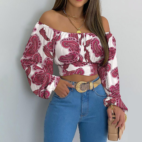Sexy Off-shoulder Boat Neck 3/4 Trumpet Sleeve Printed Blouse
