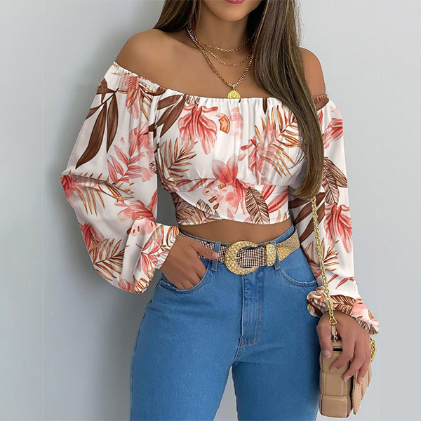 Eager for a sexy and charming weekend look? Then you can just don this little piece. It features chic and eye-catching printed pattern,the off-shoulder boat neck and trumpet sleeve design will further enhance your feminine appeal. When matching with a high waist skirt and a choker necklace,you can look beautiful enough!