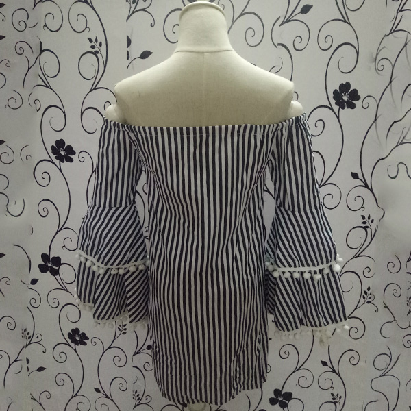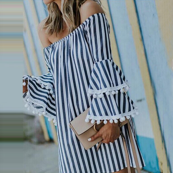 its off-shoulder wide neckline and hairball spliced trumpet sleeve design make this piece look so sexy and distinctive.