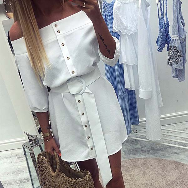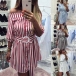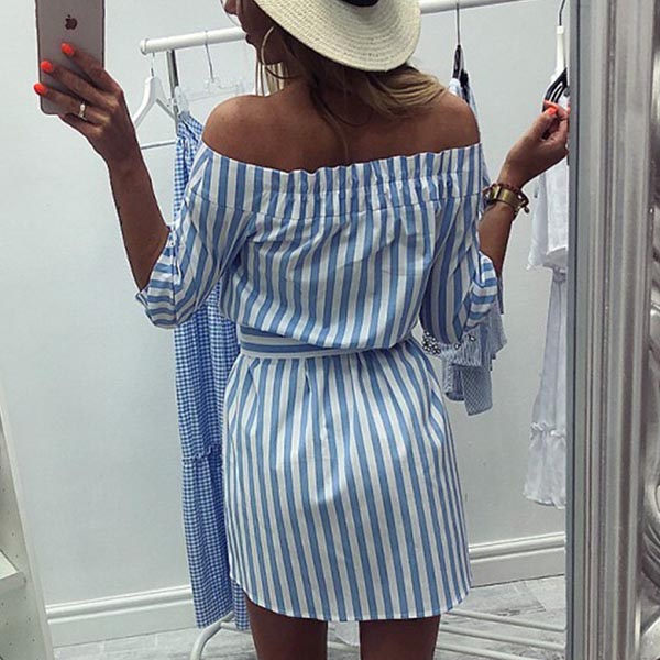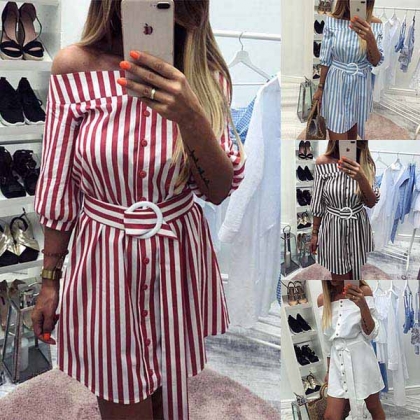 Sexy Off-shoulder Boat Neck Half Sleeve Single-breasted Striped Dress
