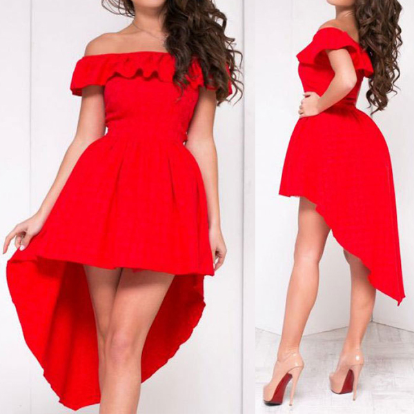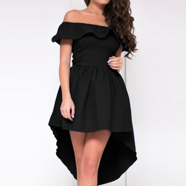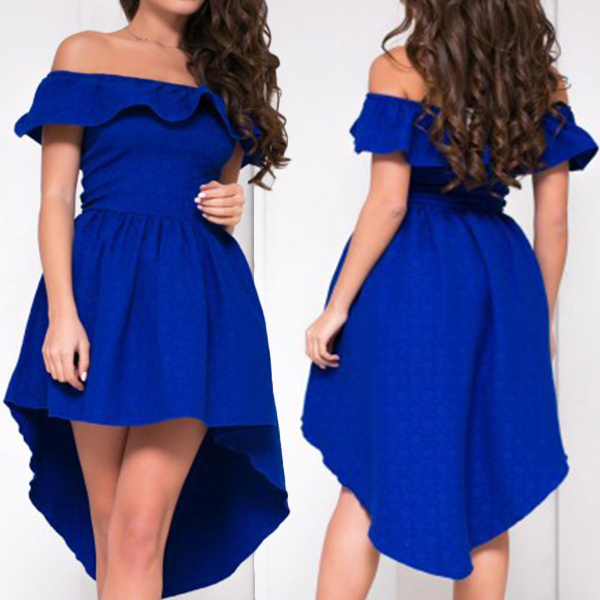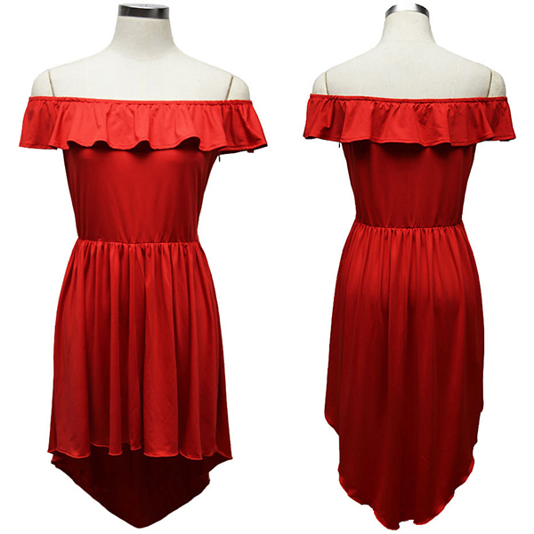 color tone,accompanied with a ruffle wide neckline,high waist and high-low hem,this dress can make your female charm and