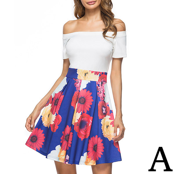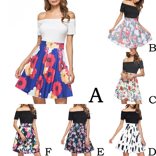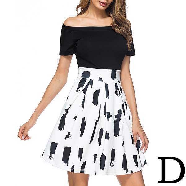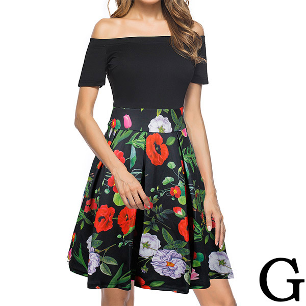 The off-shoulder boat neck and printed spliced design make this piece look so sexy and attractive.