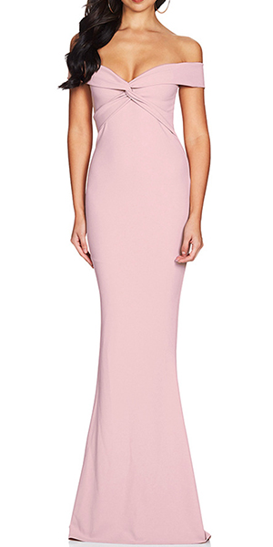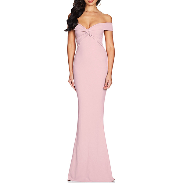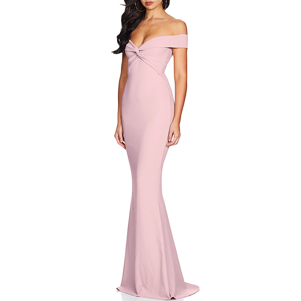 in this gorgeous dress. Boasts a sweet pink tone,designed with an off-shoulder boat neck,high