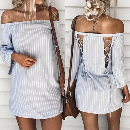 Sexy Off-shoulder Boat Neck Hollow out Lace-up Striped Dress