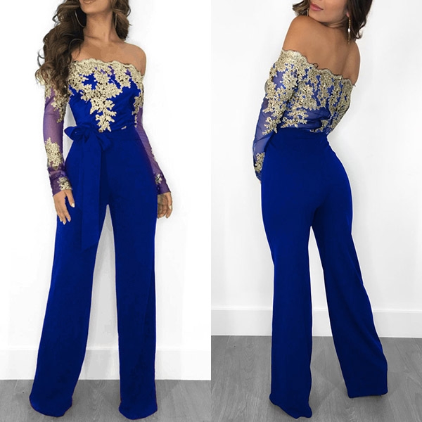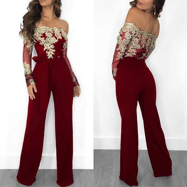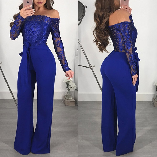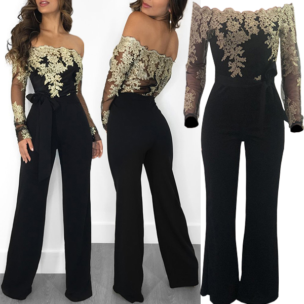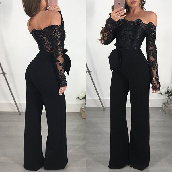 How could you look so alluring and sexy when you wear this jumpsuit? The off-shoulder boat neck and lace spliced design make it look so sexy and sultry,while the high waist and fit silhouette design candemonstrate your slender figure. Wear it to tonight's cocktail party,you can easily arouse a splash.