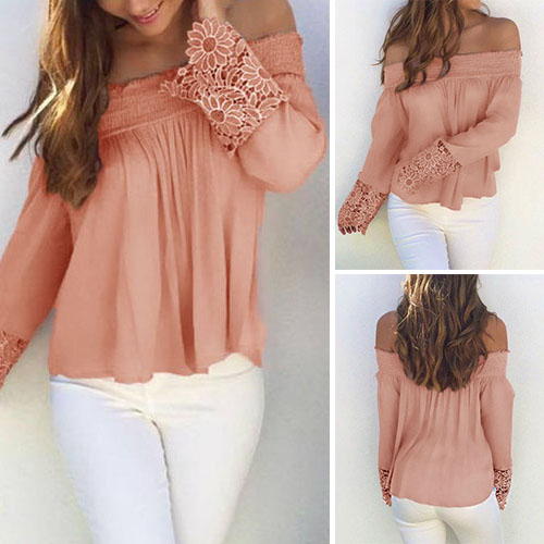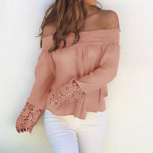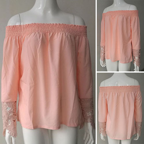 with an off-shoulder wide neckline and lace spliced long sleeve,this top is perfect for matching with your high