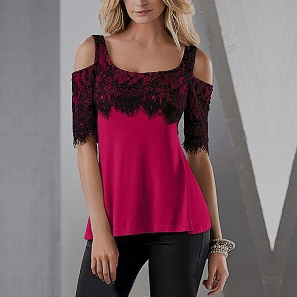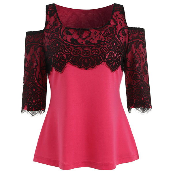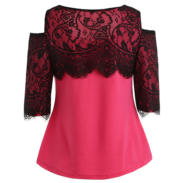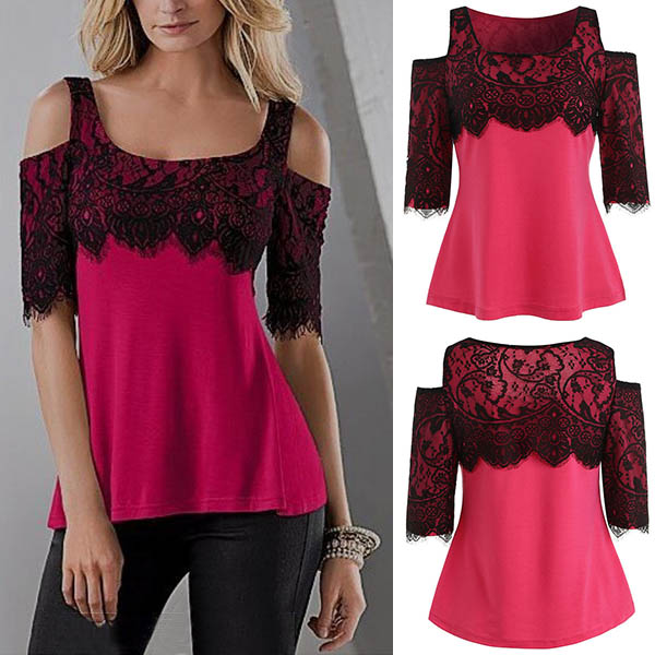 If you wanna a sexy yet feminine style,you can count on this t-shirt. The off-shoulder and lace spliced