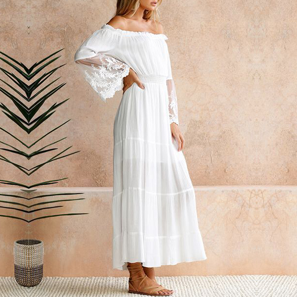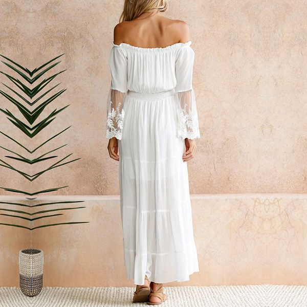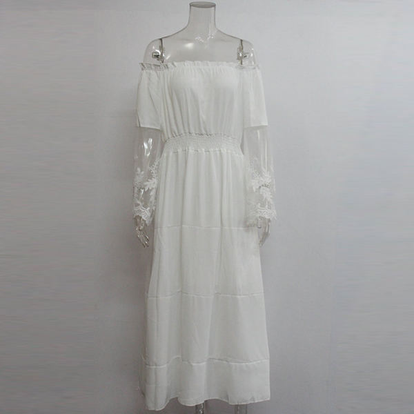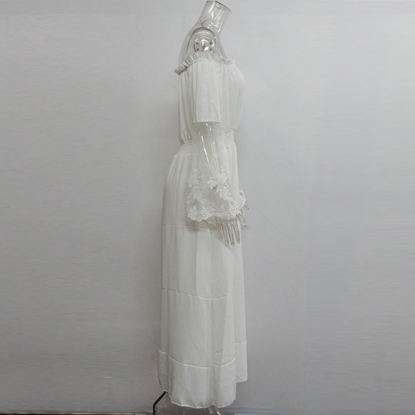Sexy Off-shoulder Boat Neck Lace Spliced Trumpet Sleeve Dress