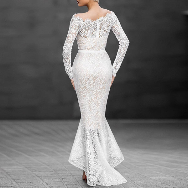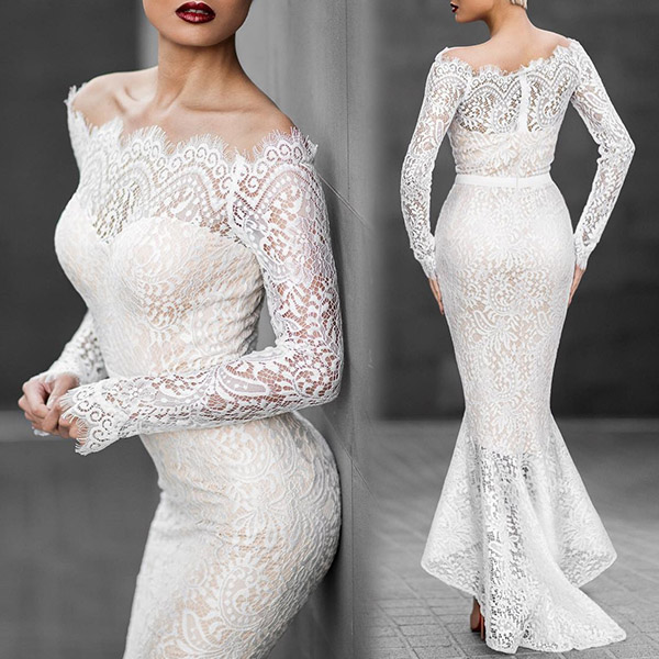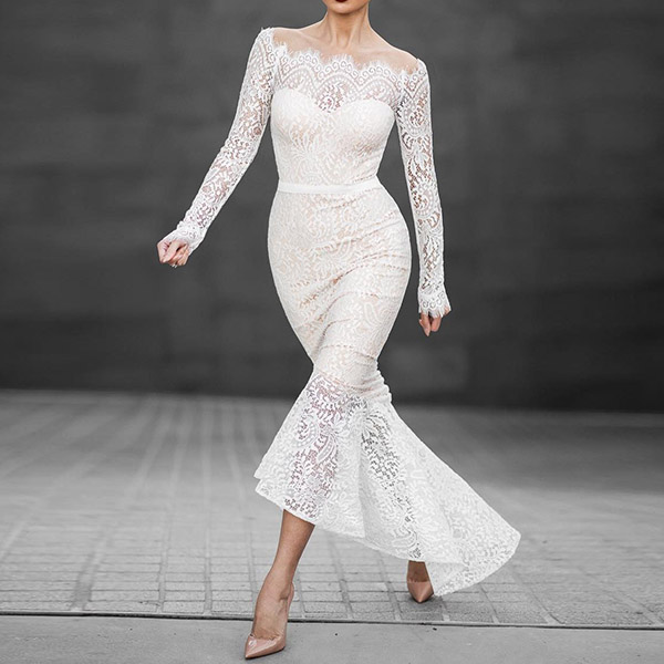 attention. The off-shoulder wide neckline and dovetail hem design make this dress look more alluring. You can easily