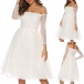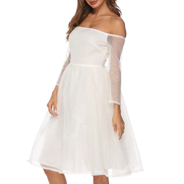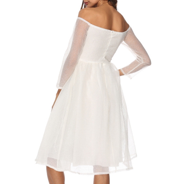 pure yet stylish white tone,the off-shoulder boat neck and gauze spliced design can better exude your