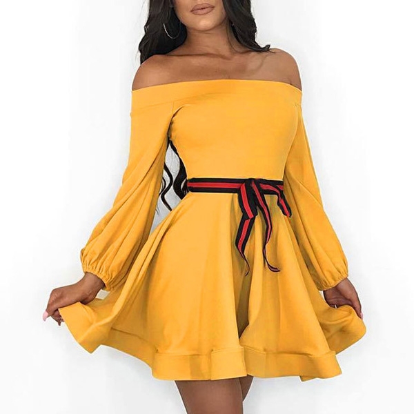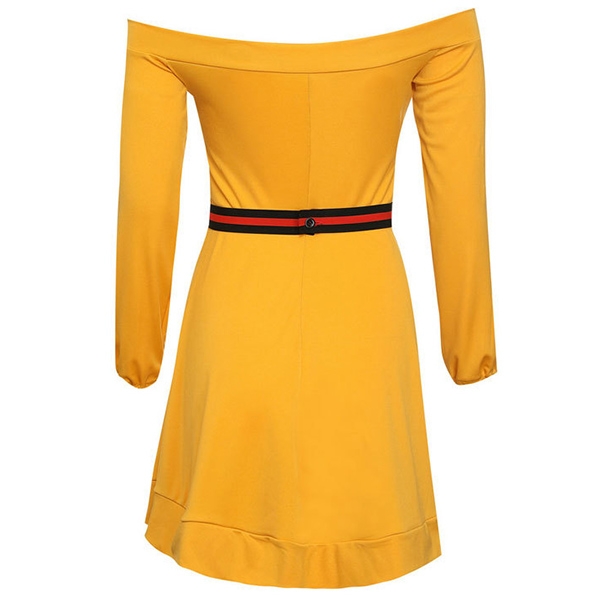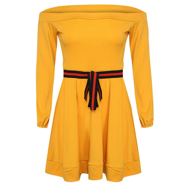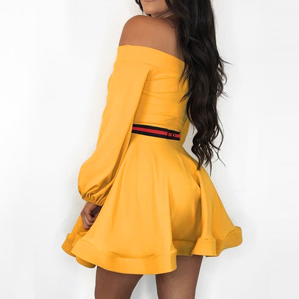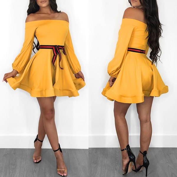 This dress comes with a bright yellow tone,which can better highlight your fair skin,while the off-shoulder