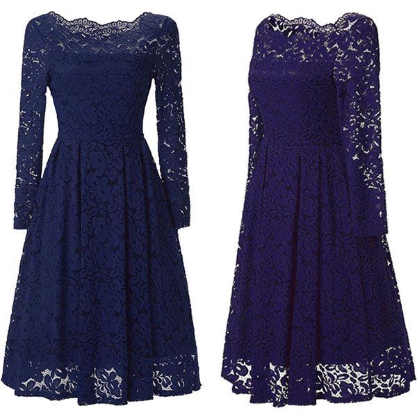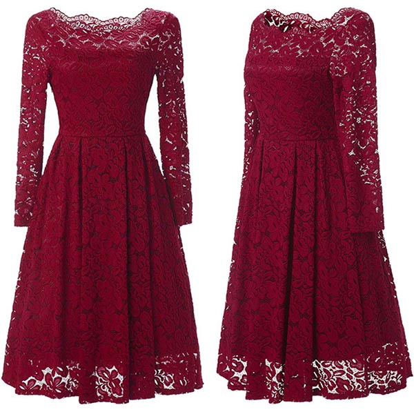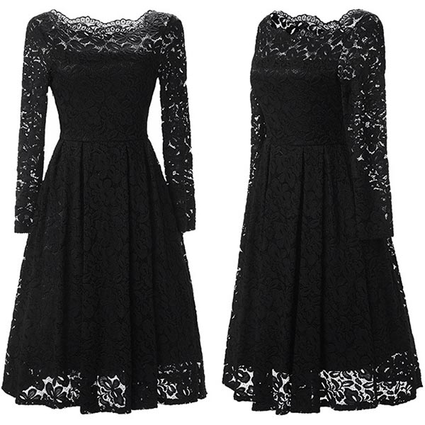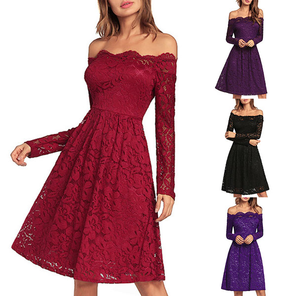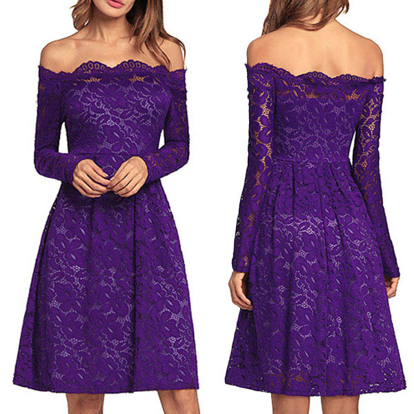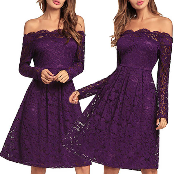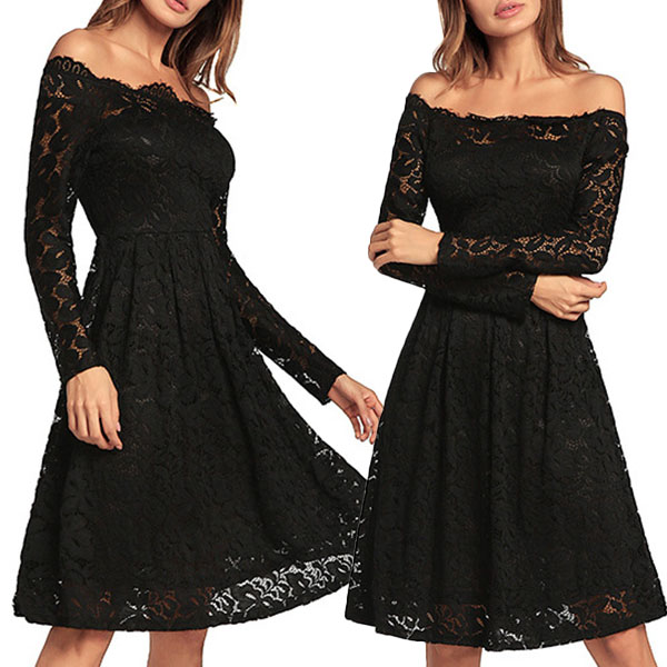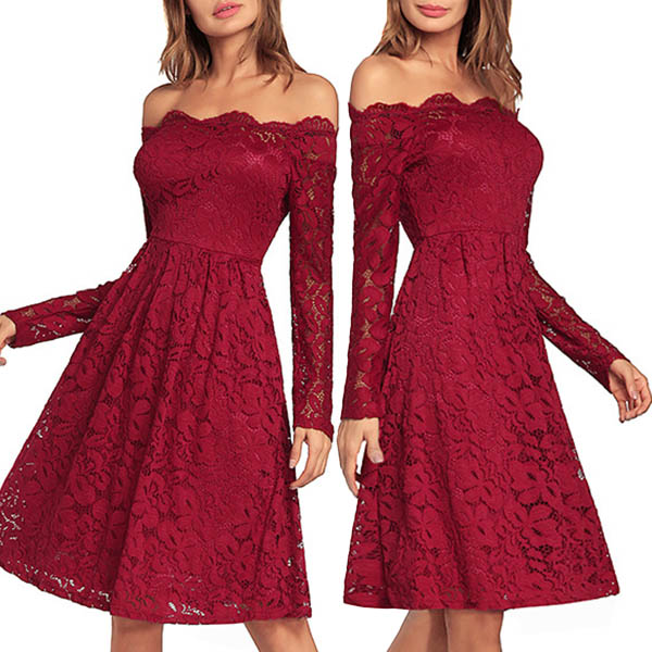 for tonight's party. So we suggest you this lace dress. It is styled with long sleeve,off-shoulder boat neck,