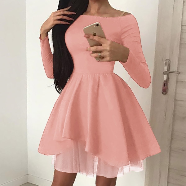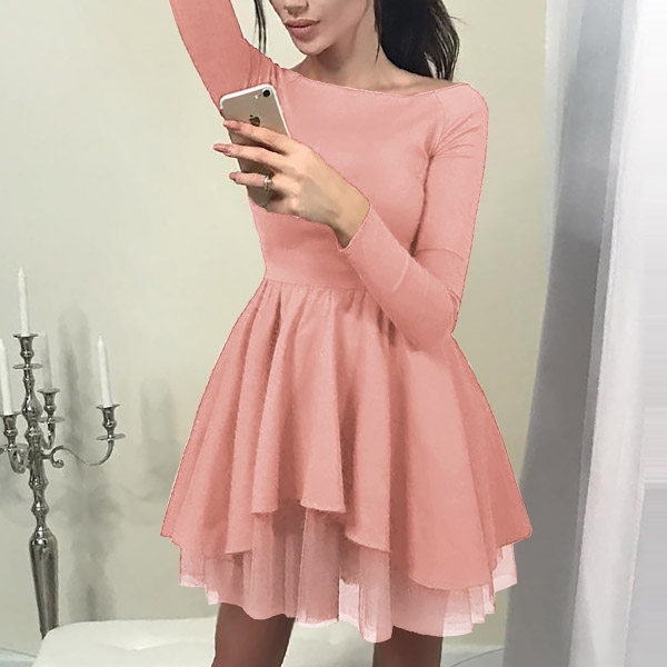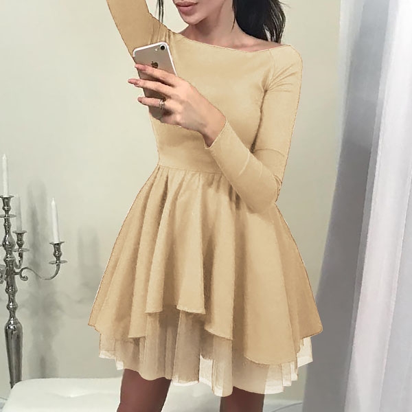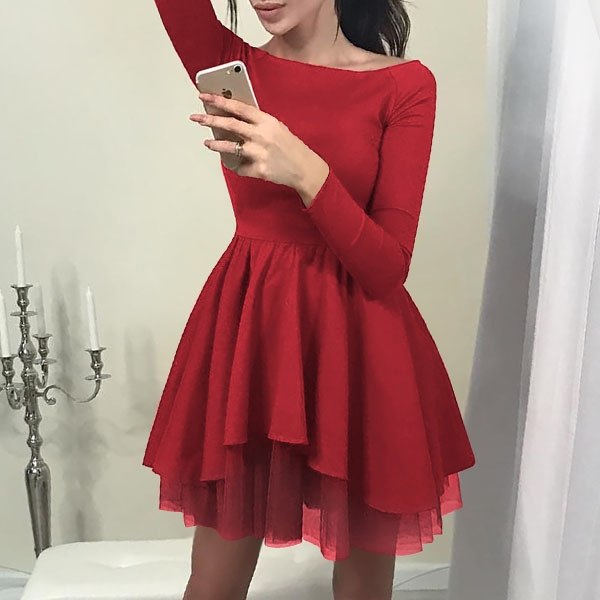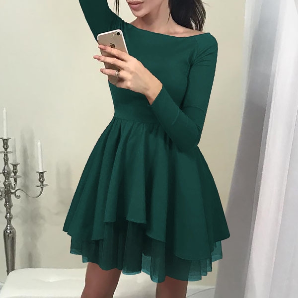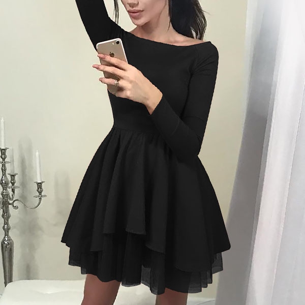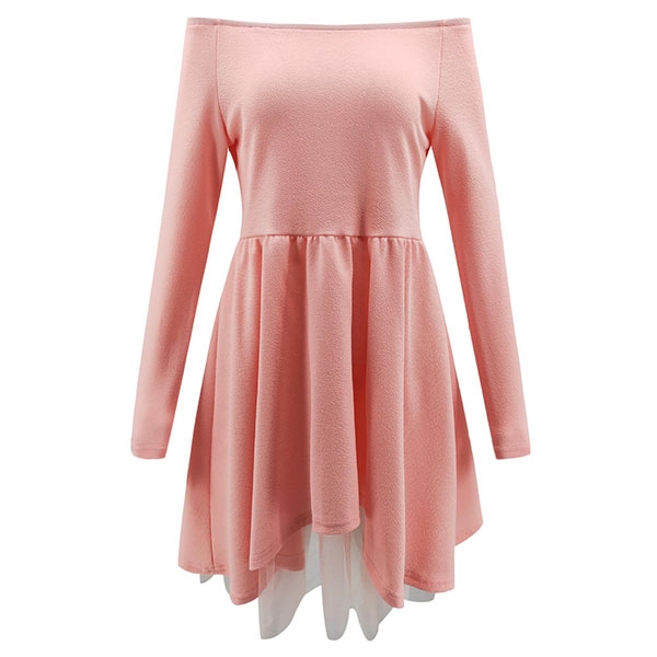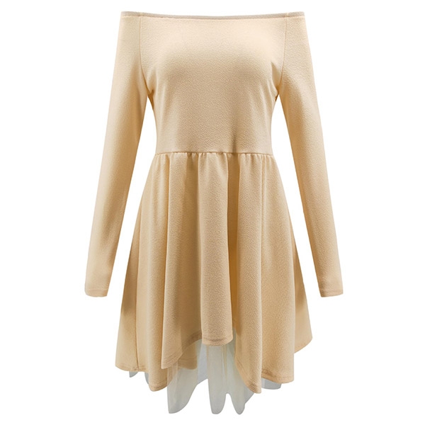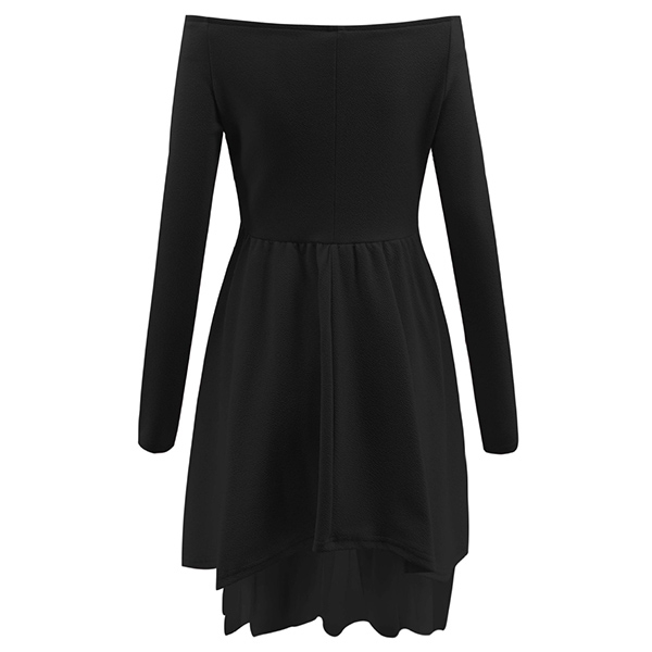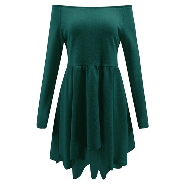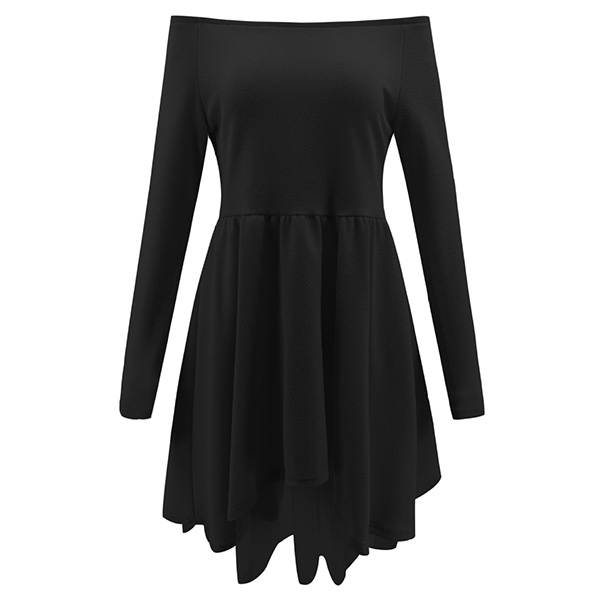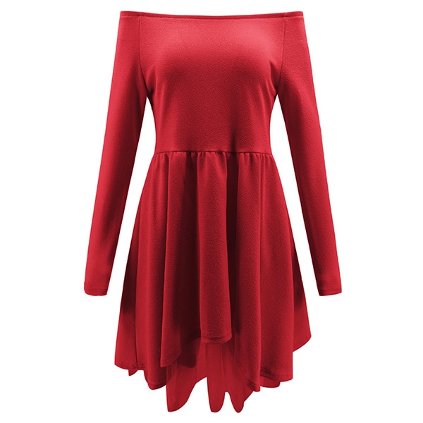 this dress in your team. It boasts a solid color,the off-shoulder boat neck and irregular hem design will