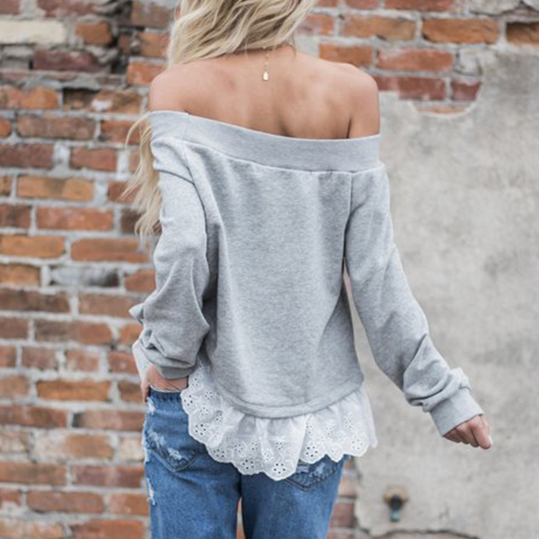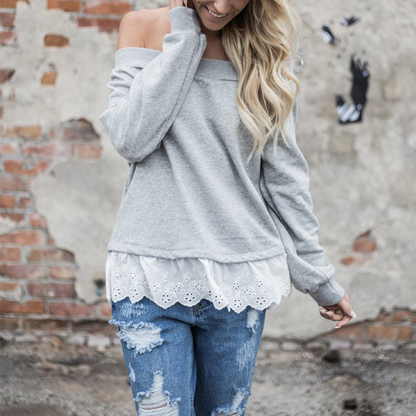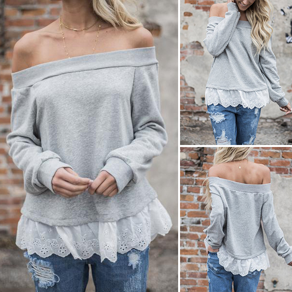wide neckline and lace spliced hem design makes this piece more attractive. It is a good idea to match with your skinny jeans.