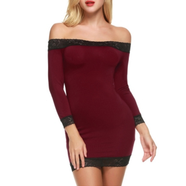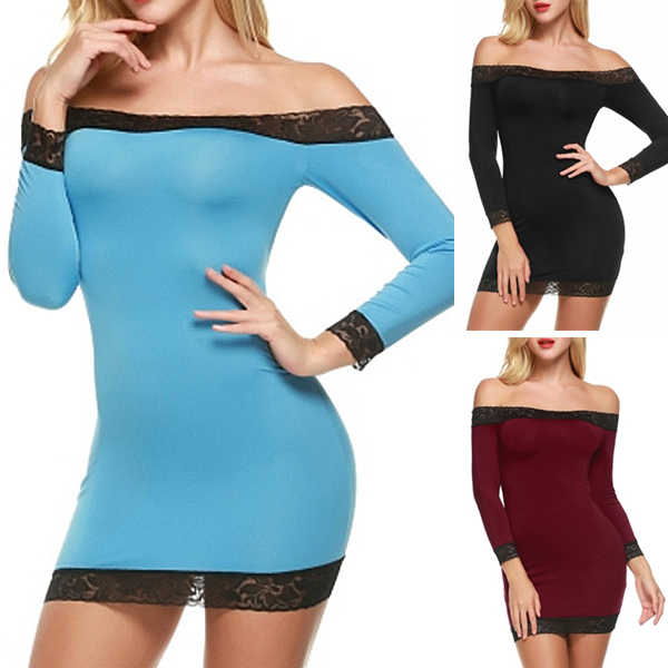 off-shoulder wide neckline,a super fit silhouette and lace spliced details,sexy and alluring. We suggest you