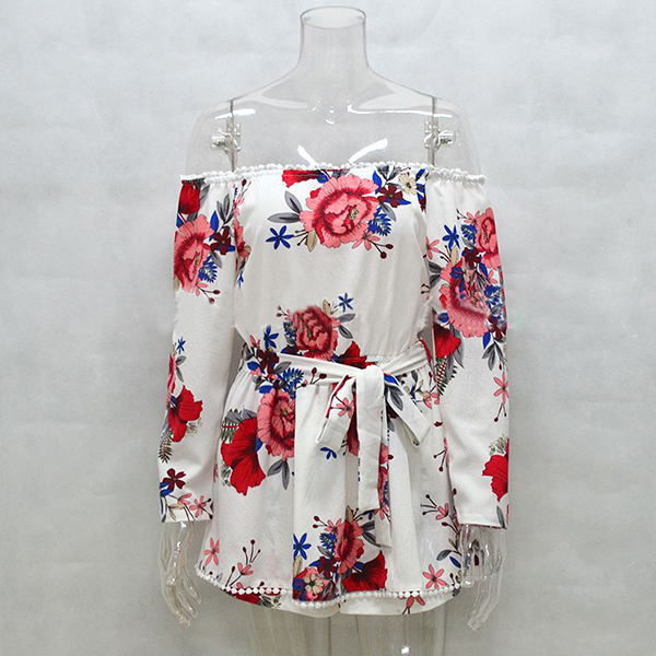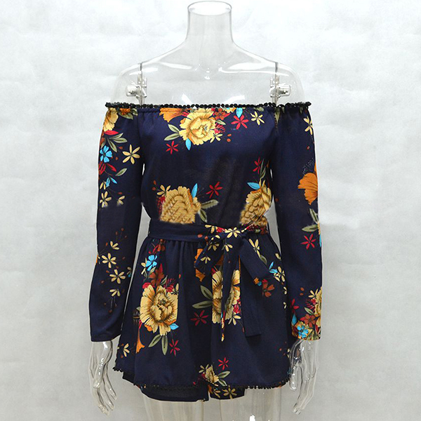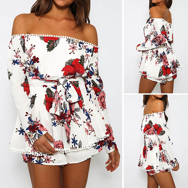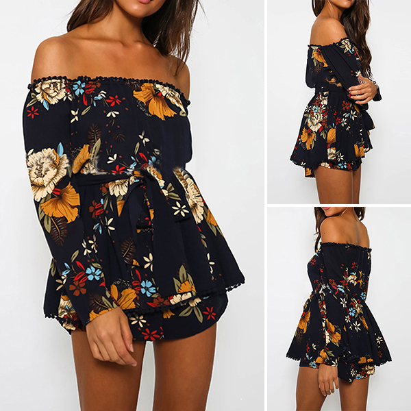 Be a charming girl in this romper! Features vivid and vibrant floral print,with an of-shoulder wide neckline and long sleeve design,