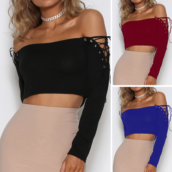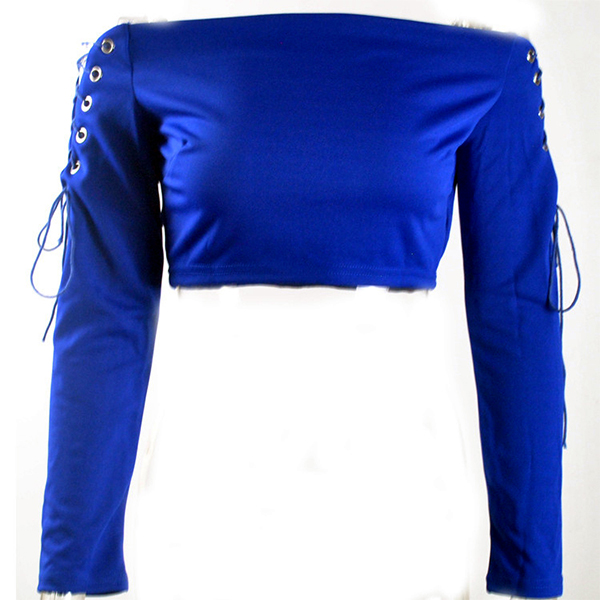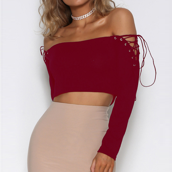 Solid color style,designed with an off-shoulder boat neck,long sleeve and lace-up details,sexy and seductive.