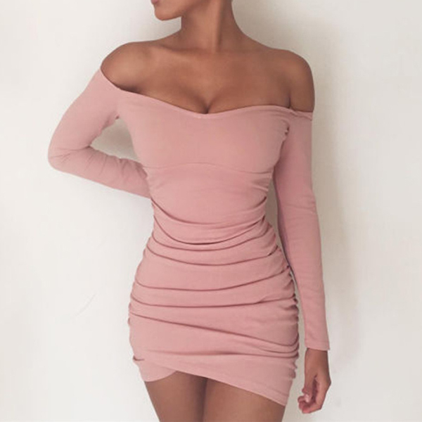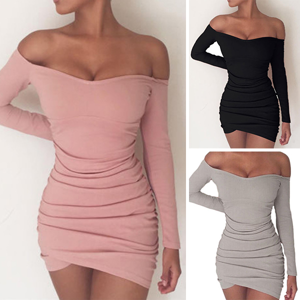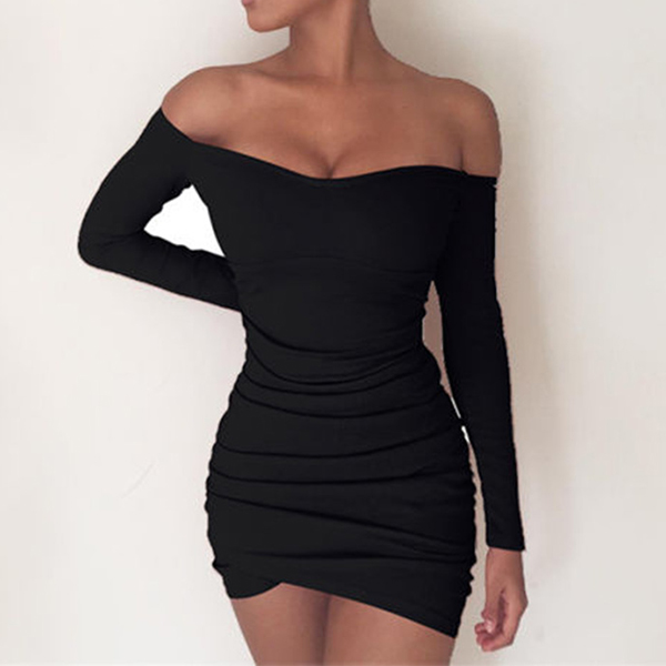 Sexy Off-shoulder Boat Neck Long Sleeve Solid Color Mini Tight Dress