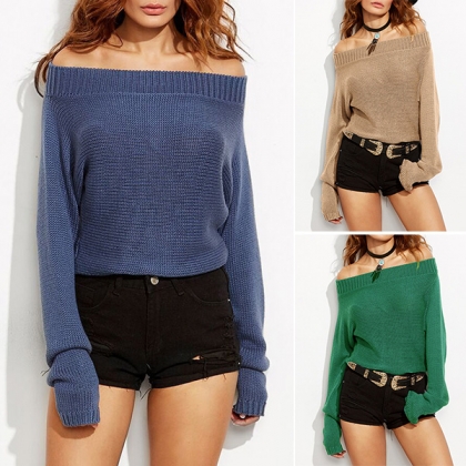 Update your wardrobe ensemble with this long sleeve sweater. Solid color style,the off-shoulder wide neckline design