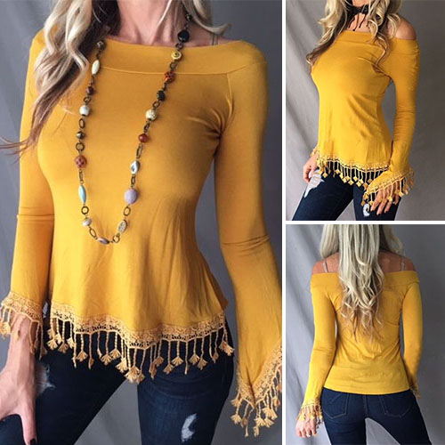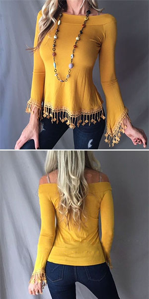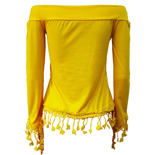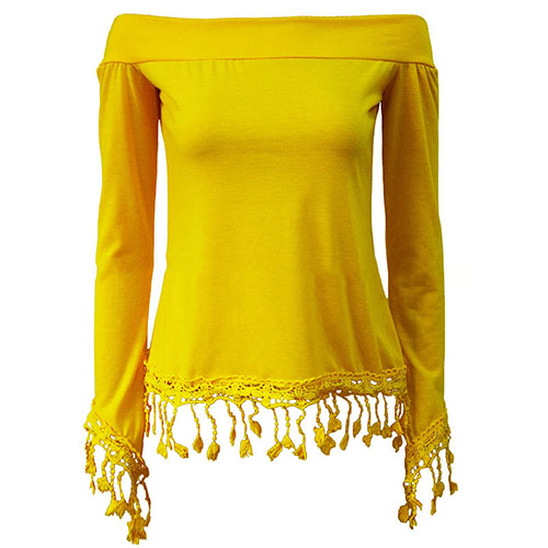 This t-shirt features a bright yellow tone to highlight your fair skin. Outfitted with long sleeve,off-shoulder wide